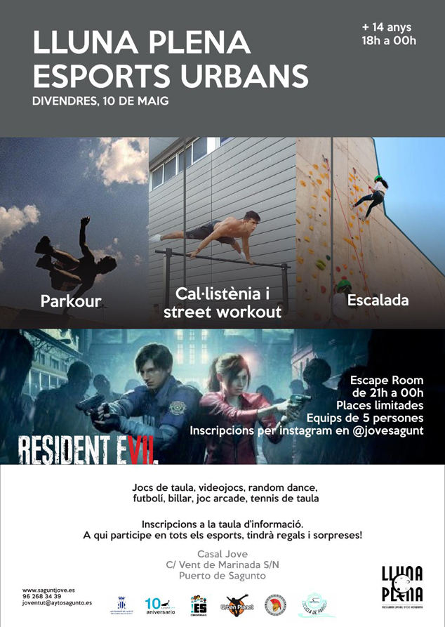 El programa d'oci alternatiu Lluna Plena torna este divendres amb especial dedicació als esports urbans. La regidoria de Joventut de l'Ajuntament de Sagunt proporciona una sèrie de tallers i activitats per a joves de més de 14 anys que tindran lloc este dissabte 10 de maig, de 18 a 24 hores en el Casal Jove del Port de Sagunt.