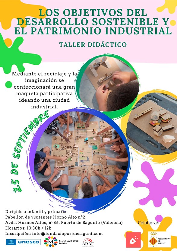 El pròxim 25 de setembre La Fundació de la Comunitat Valenciana de Patrimoni Industrial i Memòria Obrera del Port de Sagunt organitza al costat de Arae Patrimoni i Restauració, el taller didàctic “Els objectius del desenvolupament sostenible i el patrimoni industrial”, amb la col·laboració de l'Ajuntament de Sagunt.