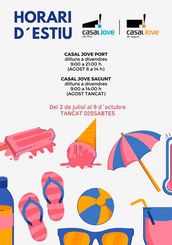 El departament de Joventut i Infància de l’Ajuntament de Sagunt informa a la ciutadania que l’horari dels Casals canvia durant la temporada estival. En el cas del Casal Jove de Port de Sagunt, el centre estarà obert de dilluns a divendres de 9 a 21 hores i, concretament, a l’agost de 8 a 14 hores. Pel que fa al Casal Jove de Sagunt, estarà obert de dilluns a divendres de 9 a 14 hores i permaneixerà tancat durant el mes d’agost. Cal destacar que els dos centres no estaran oberts al públic durant els dissabtes del 2 de juliol al 9 d’octubre.