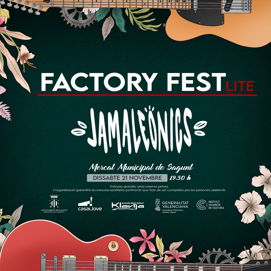 El Factory Fest Lite continua dissabte, 21 de novembre, amb l'actuació del grup valencià Jamaleonics. El lloc serà la plaça interior del Mercat Municipal de Sagunt a partir de les 19.30 hores i les entrades ja estan esgotades.