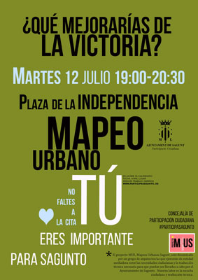 Aquest dimarts, 12 de juliol, a les 19 hores, el projecte Mapatges Urbans Sagunt (MUS), de la delegació de Participació Ciutadana de l'Ajuntament de Sagunt, es trasllada a la zona de la Victòria del Port de Sagunt, concretament a la plaça de la Independència, entorn de la qual està el grup d'habitatges de la coneguda com a Ciutat Dormida, prop del Barri Obrer.