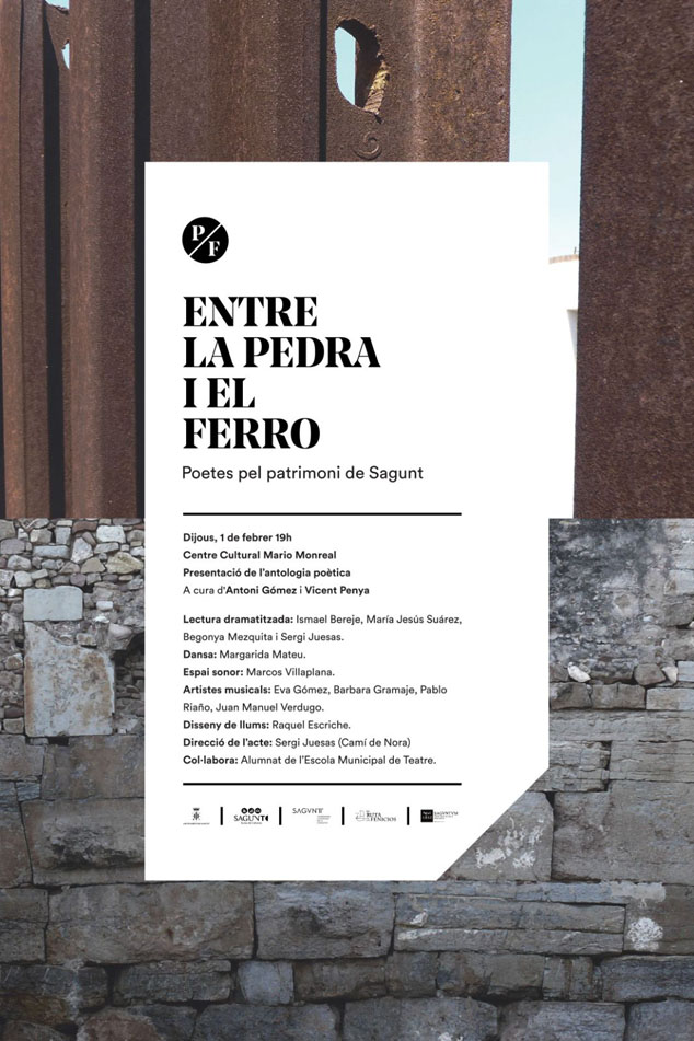 El saló d'actes del Centre Cultural Mario Monreal acollirà el dia 1 de febrer, a les 19 hores, la presentació de l'antologia poètica Entre la pedra i el ferro (poetes pel patrimoni de Sagunt), un llibre que s'ha publicat amb motiu del procés de reconeixement internacional de la ciutat de Sagunt, a través de la presentació de la candidatura a Patrimoni de la Humanitat, i que ha comptat amb la col·laboració de l'Ajuntament de Sagunt i altres entitats.