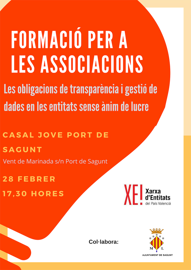 La sessió formativa ‘Transparència de les associacions i protecció de dades en les Entitats No Lucratives’ se celebrarà este dijous, 28 de febrer, a les 17.30 hores en el Casal Jove del Port de Sagunt. El curs, organitzat per por la Xarxa d’entitat del País Valencià, no requerix inscripció prèvia.