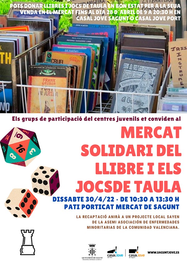 Els grups de participació dels centres juvenils del departament de Joventut i Infància de l'Ajuntament de Sagunt organitzen per a este dissabte, 30 d'abril, el segon Mercat Solidari de llibres i jocs de taula, que es desenvoluparà entre les 10.30 i les 13.30 hores al pati porticat del Mercat de Sagunt (plaça Cronista Chabret, 9) i que en esta edició donarà visibilitat al projecte Sayen, nascut en el municipi.