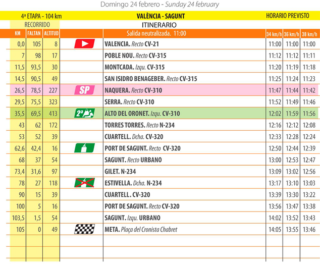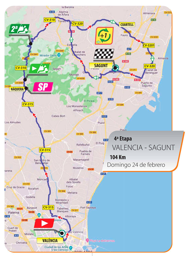 El recorregut de la quarta etapa serà el següent: València, Poble Nou, Moncada, Sant Isidre de Benaixeve, Nàquera, Serra, Alt de l’Oronet, Torres-Torres, Quartell, el Port de Sagunt i Sagunt, on tindrà lloc la meta.