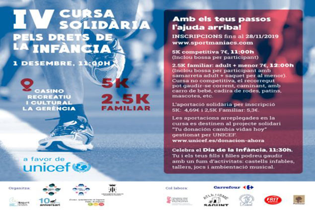 Este diumenge 1 de desembre tindrà lloc a les 11 hores al Port de Sagunt la IV Carrera Solidària a favor d'Unicef ‘Pels drets de la Infància’. La carrera, com tots els anys, està organitzada pels departaments de Joventut i Cooperació Internacional de l'Ajuntament de Sagunt, amb la col·laboració de la regidoria d'Esports i els clubs locals d'atletisme: Atletisme Sagunt i Club Camp de Morvedre. També hi col·laboren empreses com Carrefour, Frit Ravich, Panamà i Importaco.