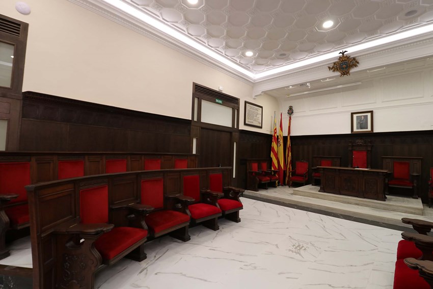 La remodelació del saló de plens del Consistori ja ha acabat i este mateix matí ha tingut lloc la firma de l'acta de recepció de les obres. El propòsit d'esta intervenció era modernitzar la seu de la sobirania municipal i transformar-la en un lloc inclusiu sense barreres arquitectòniques i amb els mitjans tècnics actualitzats.