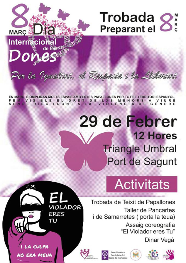 Les activitats que inclou la programació són una quedada de teixit de papallones, que forma part d'una iniciativa amb la que s'ompliran molts espais amb estes papallones per tot el territori espanyol durant el mes de març. També, en esta trobada tindrà lloc un taller de pancartes i samarretes (porta la teua) i l'assaig de la coreografia El violador eres tu, i finalment, un menjar vegà.