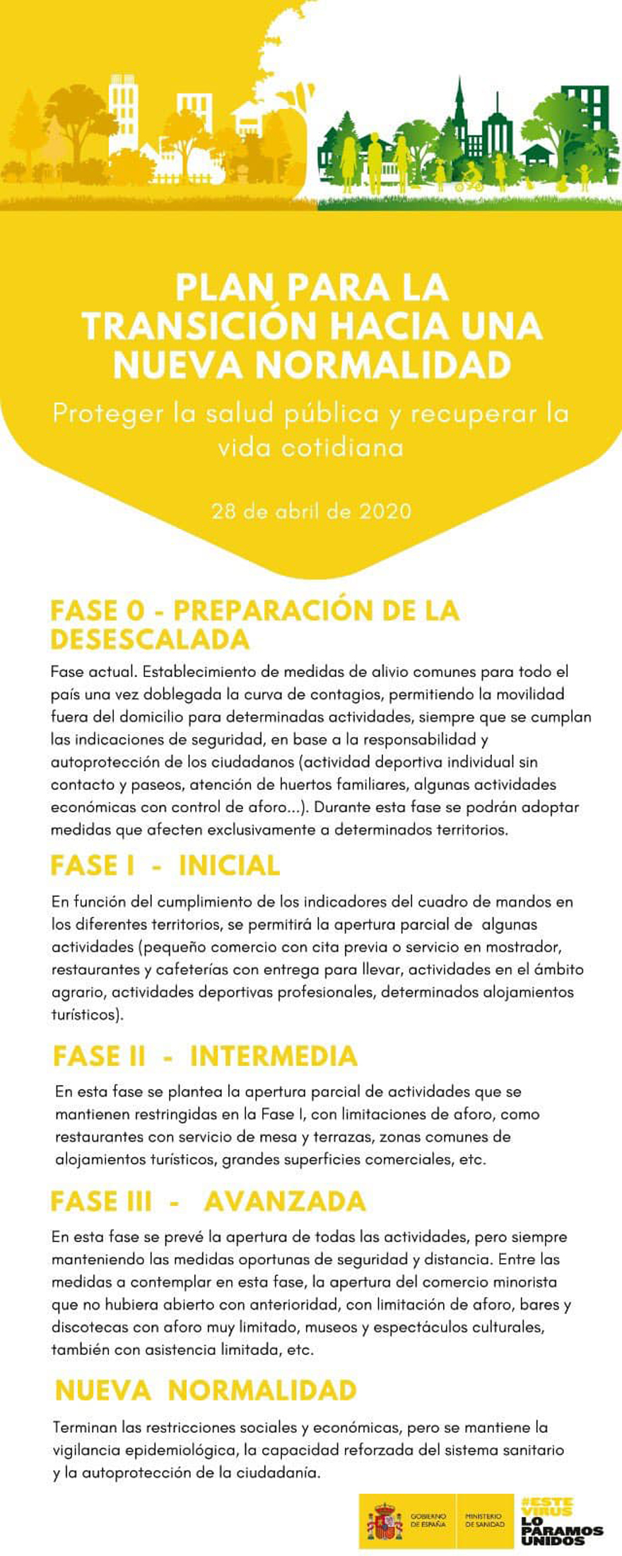 El Govern d'Espanya ha impulsat un pla de desescalada compost per quatre fases la successió de les quals dependrà de com evolucione la covid-19 i la disminució de la seua propagació. L'objectiu d'este Pla és la Transició Escalonada cap a una Nova Normalitat, tractant de recuperar la vida quotidiana, en la mesura que siga possible, i protegint la salut pública. És important destacar que es tracta d'un procés de desescalada que ha de ser gradual, asimètric, coordinat amb les comunitats autònomes, i adaptable als canvis d'orientació necessaris en funció de l'evolució de les dades epidemiològiques i de l'impacte de les mesures adoptades, segons s'indica en el citat pla.
