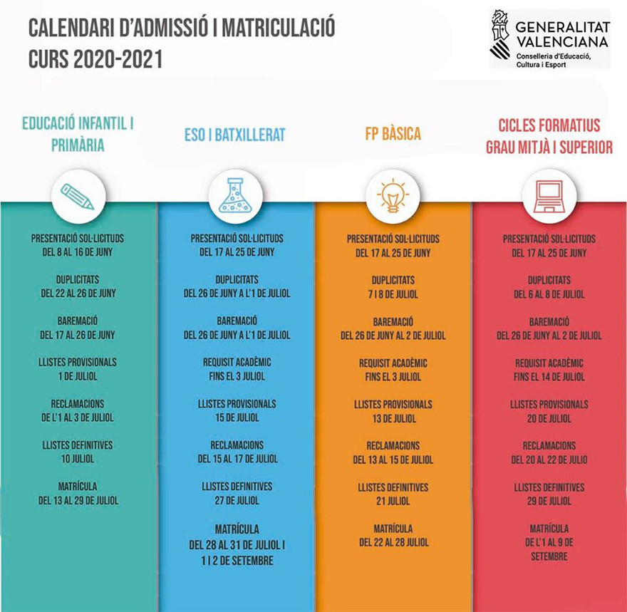 En primer lloc, el termini per a la presentació de sol·licituds per a Educació Infantil i Primària serà del 8 al 16 de juny, i les llistes provisionals d'admesos podran consultar-se a partir de l'1 de juliol. En el cas de l'alumnat d'ESO, Batxillerat i FP, podran presentar les seues sol·licituds del 17 al 25 de juny, mentre que les llistes provisionals es donaran a conéixer el 15, 13 i 20 de juliol respectivament. A través del següent