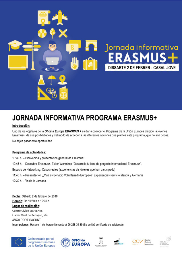 El dissabte 2 de febrer el Centre Cívic ‘Els Vents’ (carrer Vent de Penagall, s/n 46520 Port Sagunt) acollirà la Jornada Informativa Programa Erasmus+. L'horari serà de 10.30 a 12.30 h i les inscripcions estaran disponibles fins a l'1 de febrer telefonant al 96 268 34 39. Per als interessats, s'emetrà un certificat d'assistència.
