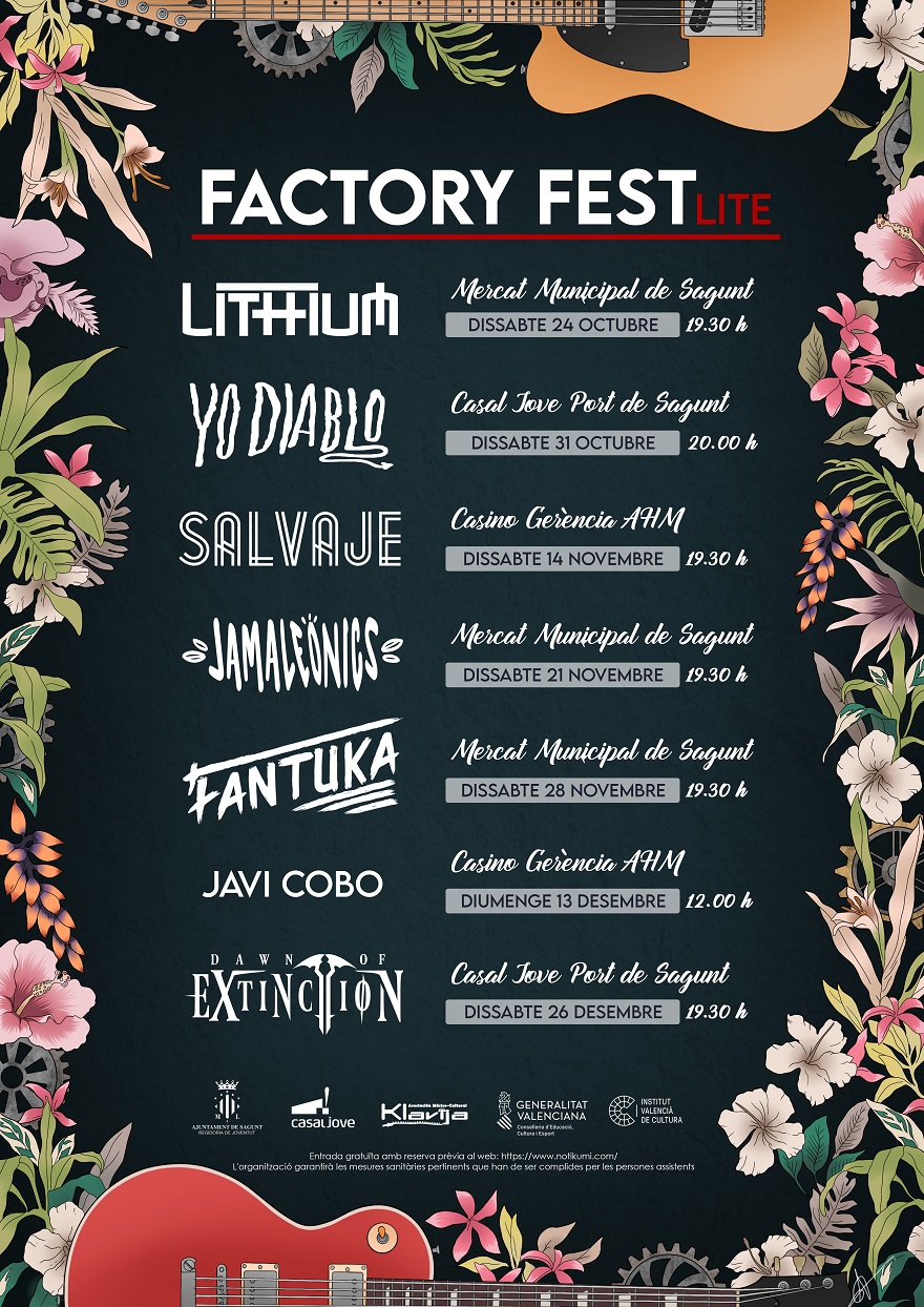 Per este motiu, tal com ha explicat el regidor de Joventut, Guillermo Sampedro, «ara se celebrarà en manera Lite, és a dir, en un altre format més lleuger fent-lo més senzill però allargant-lo en el temps». Per tant, els grups i músics joves de la localitat que componien el cartell inicial del festival, que anava a realitzar-se al setembre i va ser cancel·lat, actuaran de manera separada en diferents dates i llocs del municipi. Per a això, la regidoria ha triat tres espais i anirà realitzant concerts entre els mesos d'octubre de 2020 i abril de 2021. Amb això, es donarà cabuda als setze artistes o grups inicials, a més d'altres bandes que s'havien quedat en reserva i, ara, entraran en este nou Factory Fest Lite. Estos espais seran el Mercat de Sagunt, els Jardins del Casino de la Gerència i el Casal Jove del Port de Sagunt, amb concerts a celebrar un cada setmana en dissabte o diumenge.