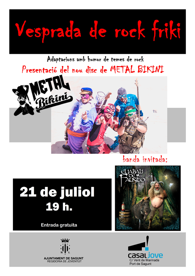 Dos grups que interpreten adaptacions amb humor de cançons que formen part de l'imaginari col·lectiu rocker seran els encarregats d'amenitzar la vesprada del divendres. El grup Metal Bikini aprofitarà l'acte per a presentar el seu disc. És un grup de Sagunt format fa tres anys dedicat a la paròdia de temes de rock i heavy. S'identifiquen com a rock friki, ja que les seues lletres parlen d'anime, ciència ficció, rol, videojocs… ells ho anomenen Freak Rock Intergalàctic, combinant covers d'anime amb adaptacions lliures de rock i metal, des d'un humor sa i apte per a tots els públics.