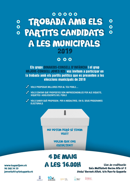 Este dissabte, 4 de maig, els diferents grups de participació infantil i juvenil de la regidoria de Joventut, els Corresponsals i el Consell de la Infància juntament amb Dinakids i HRJoce, han organitzat dos sessions de presentació de programes electorals municipals relacionats amb la infància, adolescència i joventut. Esta trobada amb els partits candidats a les eleccions municipals 2019 tindrà lloc a les 16 hores a la Sala Multiusos del Forn Alt del Port de Sagunt. Allí, els més jóvens davall el lema “No votem, però tenim veu, volem que ens escolten”, podran proposar millores per al poble i conéixer què es planteja en matèria de joventut.