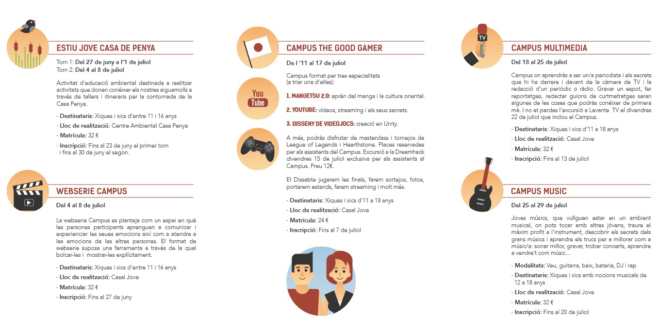 De l'11 al 17 de juliol tindrà lloc el Campus “The Good Gamer”, format per tres especialitats: Mangetsu (coneixements sobre el manga i la cultura oriental), Youtube (entorn de la cultura del streaming i la cultura del youtube) i Disseny de Videojocs (amb masterclass i tornejos, així com excursió al Festival Dreamhack de València). El preu de matrícula és de 24€. La següent setmana, la del 18 al 25 de juliol, se celebra el “Campus Multimèdia”, on els joves aprendran a ser periodista i els secrets que hi ha darrere i davant d'una càmera, de la redacció d'un periòdic o d'una emissora de ràdio. Gravaran spots, reportatges, elaboraran guions de curtmetratges, així com una excursió a Llevant Televisió. El cost és de 32€.