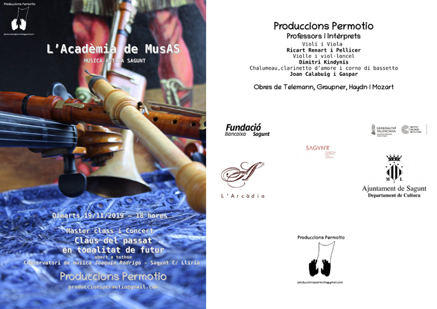 El departament de Cultura de l'Ajuntament de Sagunt organitza demà, dimarts 19 de novembre, una classe magistral i un concert. Totes dos activitats, que estan dins del cicle MusAS (Música Antiga de Sagunt), es desenvoluparan a partir de les 18.00 fins a les 21.00 hores en el saló d'actes del Conservatori de Música Joaquín Rodrigo de Sagunt, situat al carrer Llíria.