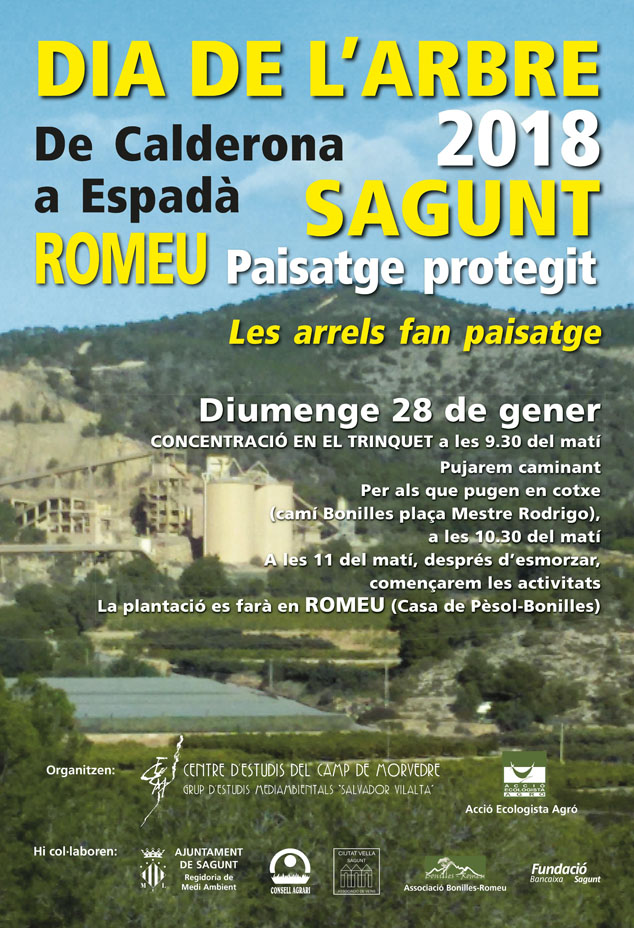 L’Ajuntament de Sagunt, Acció Ecologista-Agró i el Grup d'Estudis Mediambientals "Salvador Vilalta" del Centre d'Estudis del Camp de Morvedre organitzen diumenge que ve, 28 de gener, el Dia de l'Arbre de Sagunt, amb una plantació que enguany tornarà a celebrar-se en la Muntanya de Romeu.