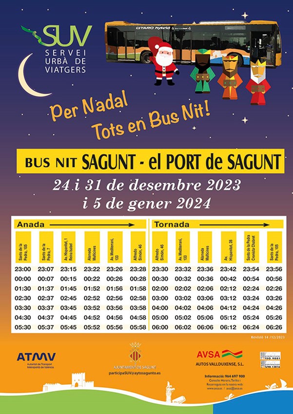 L'Ajuntament de Sagunt, des de la regidoria de Mobilitat Urbana, posa en marxa la campanya 'Per Nadal, Tots en Bus Nit!', que amplia el servici d'autobús nocturn durant les pròximes festes nadalenques. Al servici habitual dels dissabtes, se li unirà el de les nits dels diumenges 24 i 31 de desembre, és a dir, Nit de Nadal i Nit de Cap d'Any, així com el del divendres 5 de gener, en la nit prèvia al Dia de Reis.