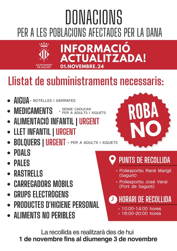 Sagunt, 1 de novembre de 2024. Davant les nombroses iniciatives de solidaritat que han sorgit a la ciutat, l’Ajuntament de Sagunt comunica a les associacions i entitats que hagen iniciat recollides de donatius per als municipis afectats, que porten el material arreplegat als pavellons René Marigil i José Veral, des d’on es coordinarà la distribució.