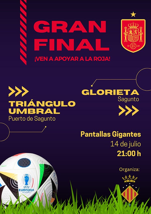 Diumenge que ve, 14 de juliol, els saguntins i les saguntines podran seguir en directe a les 21 hores la final de l'Eurocopa, en la qual Espanya s'enfronta a la selecció anglesa, a través de dos pantalles gegants instal·lades per l'Ajuntament de Sagunt en la plaça Cronista Chabret i en el Triangle Umbral.