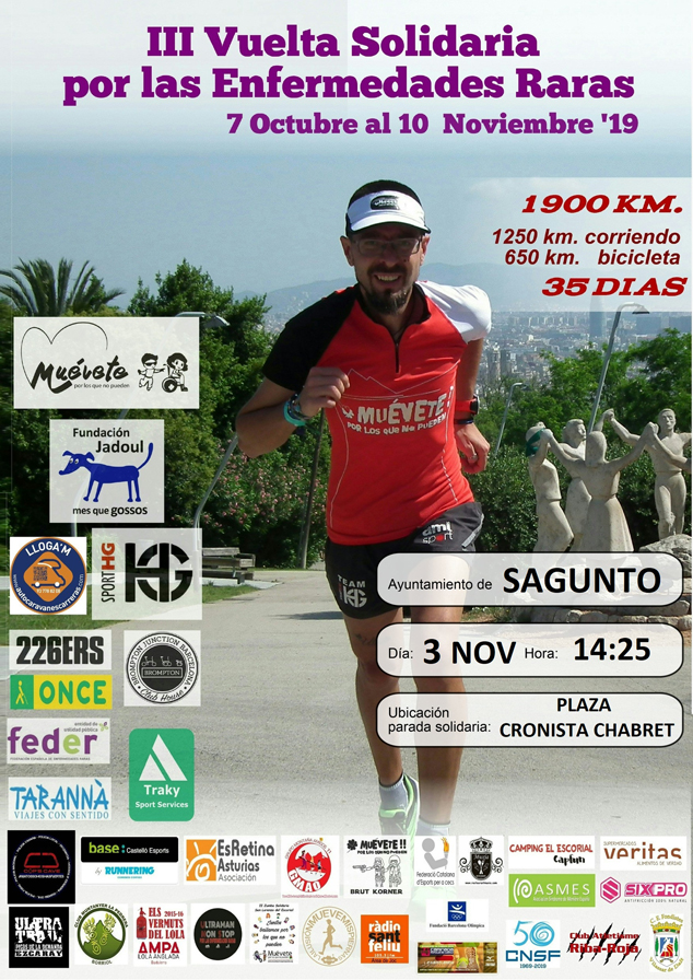 L'Ajuntament de Sagunt participarà en la III Vuelta Solidaria a España de l'associació ‘Muévete por los que no pueden’. Es tracta d'una carrera de 1.900 km a peu i bicicleta en 35 dies, contra les malalties estranyes i, per eixe motiu, diumenge que ve 3 de novembre, la plaça Cronista Chabret, a partir de les 14.25 hores, serà la meta de la 28a etapa.