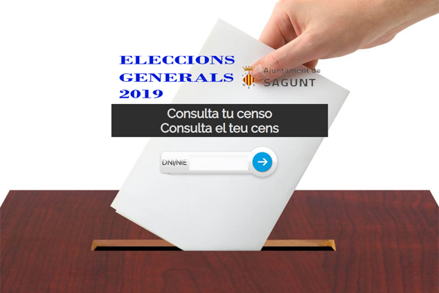 De cara als pròxims comicis electorals que se celebraran a tota Espanya el 10 de novembre, l’Ajuntament de Sagunt posa a disposició de la ciutadania el cens electoral que podrà consultar a través de diferents vies per a comprovar que no hi ha cap errada i que s'està censat per tal de poder exercir el seu dret al vot.