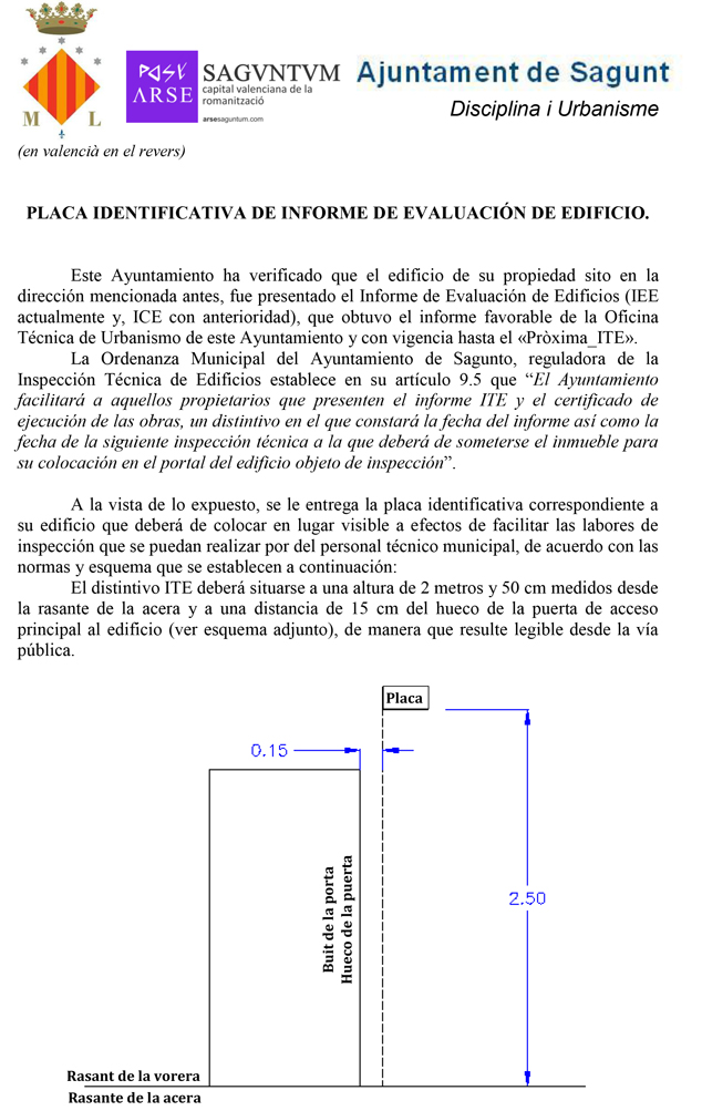 La delegació d'Urbanisme de l'Ajuntament de Sagunt posa en marxa el procés de lliurament de les plaques identificatives ITE (Inspecció Tècnica d'Edificis) que hauran de col·locar-se en el lloc exacte que s'indica. Estes plaques s'atorgaran després de la verificació dels edificis segons l'Informe d'Avaluació d'Edificis presentat a l'Ajuntament pels propietaris.