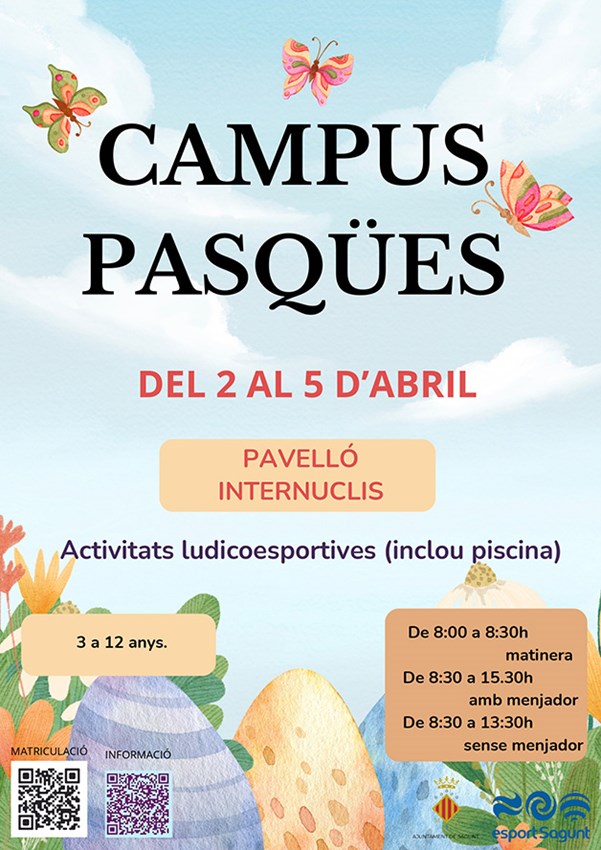 L'Ajuntament de Sagunt ha presentat hui en la Via del Pòrtic els programes dels campus de Pasqua de la regidoria d'Activitat Física, Salut i Esports, la regidoria de Joventut i Infància i la regidoria de Serveis Socials. Els tres campus es desenvoluparan durant els dies 2, 3, 4 i 5 d'abril. Els terminis d'inscripció s'obriran el 4 de març i es tancaran el 20 del mateix mes. A més, la matriculació es gestionarà a través de la web de l'Ajuntament: https://aytosagunto.apuntate.en línia/pio/.