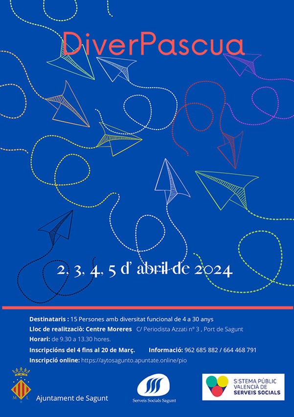Finalment, el DiverPascua que organitza la regidoria de Serveis Socials es durà a terme en Moreres (c/ Periodista Azzati núm. 3 de Port de Sagunt) en horari de 9.30 a 13.30 hores. Este campus està dirigit a persones del municipi amb diversitat funcional d'entre 4 i 30 anys. El nombre de places és de 15 usuaris/as i una llista d'espera de 5. «Hem preparat una sèrie d'activitats com expressió corporal, taller d'ombres, psicomotricitat fina i gruixuda, farem un taller de cuina amb Tomás García, de la pastisseria Chocomel, que va tindre molt d'èxit el tortell que vam fer en Nadal i elaborarem ara una mona de pasqua, i també ens traslladarem al poliesportiu per a compartir entrenaments amb els diferents clubs del municipi», ha assenyalat Núria Carbó.