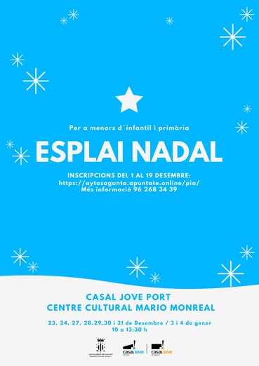 D'altra banda, Esplai Nadal, organitzada per Joventut i Infància, està plantejada per al mateix grup d'edat i en este cas els tres grups d'edat seran de 3 a 6 anys, de 7 a 9 anys i de 10 a 12 anys. Les activitats d'esta iniciativa, que torna als col·legis en esta ocasió, es desenvoluparan en el CEIP Cronista Chabret de Sagunt i el CEIP Mediterrani els dies 23, 24, 27, 28 29 30 i 31 de desembre, així com els dies 3 i 4 de gener de 2022 en horari de matí des de les 10.00 fins a les 13.30 hores.