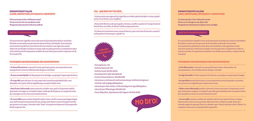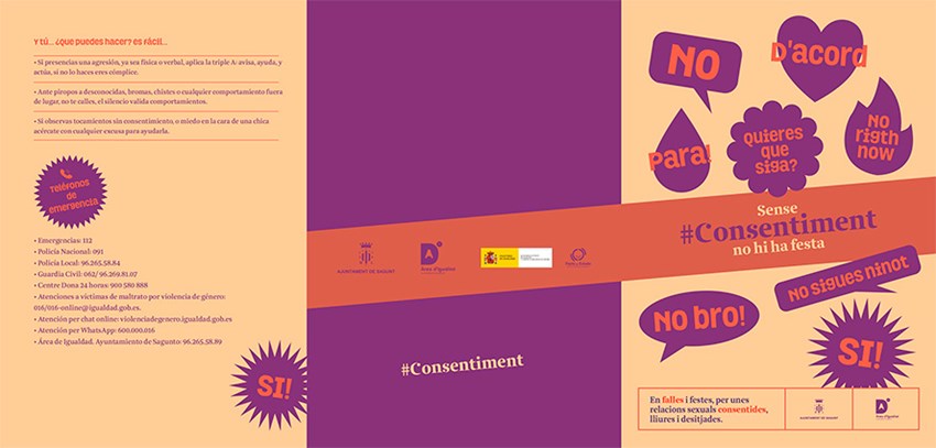 Així mateix, com s'ha citat, la regidoria d'Igualtat de l'Ajuntament de Sagunt ha presentat este matí la campanya Sense consentiment no hi ha festa, una campanya dirigida a les festes de les falles que se celebraran durant el mes de març en el municipi, i que enguany des de l'Àrea d'Igualtat han volgut basar tota esta acció de prevenció en el concepte del consentiment, entés com a acord verbal o no verbal per a participar en un acte sexual. El terme consentiment prové de la paraula consens, la qual significa acord mutu, una forma infal·lible d'assegurar la igualtat en les relacions sexuals, expliquen des de l'Àrea.