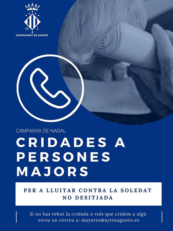 Un any més, des del departament de Majors de l'Ajuntament de Sagunt, es torna a dur a terme la campanya de Nadal de telefonar a les persones majors del municipi per a saber com es troben en estes dates. Com ja s'ha fet els anys anteriors, es posaran en contacte telefònic per a interessar-se pel seu estat i oferir-los els servicis que es presten des de l'Ajuntament de Sagunt. Esta iniciativa està dins de les accions encaminades a lluitar contra la soledat no desitjada.