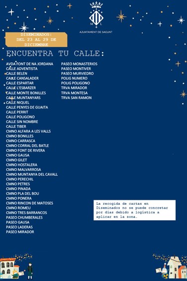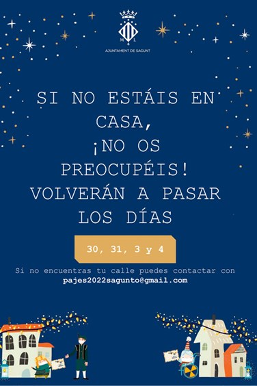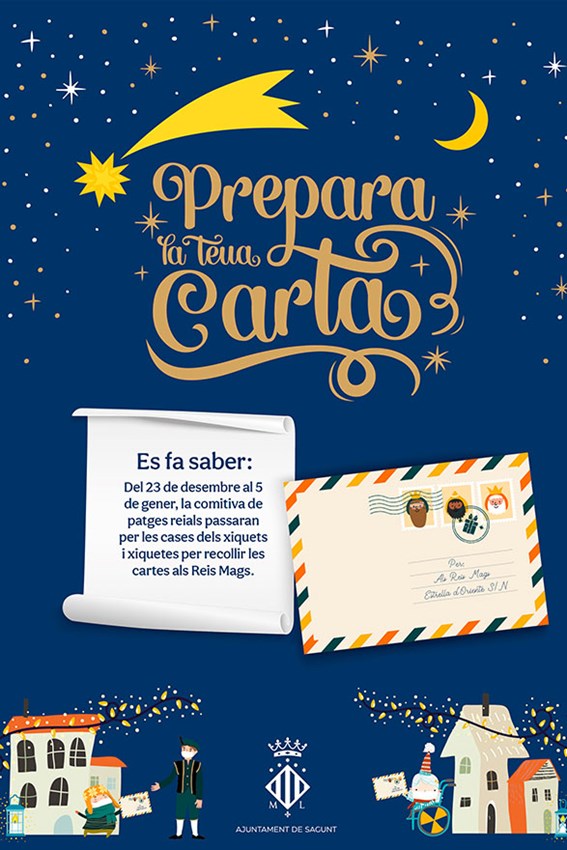 El regidor de Joventut i Infància, Guillermo Sampedro, ha informat que enguany han tornat a parlar amb ses majestats els Reis Mags: «Ens han demanat que garantim que tots els xiquets i xiquetes de Sagunt envien les seues cartes. Per eixa raó i tenint en compte la situació de pandèmia en la qual ens trobem, posem a la disposició de tots els menuts un exèrcit de patges reials que aniran casa per casa recollint totes i cadascuna de les cartes».