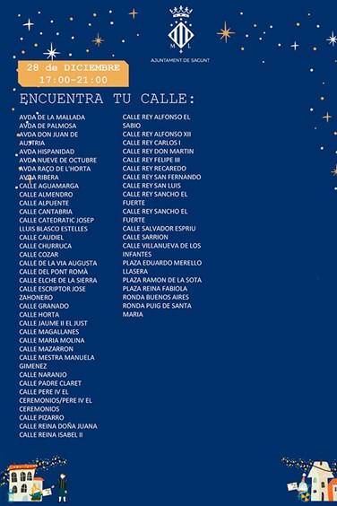 El dia 28, també en horari de 17 a 21 hores, visitaran els carrers 3 d'Abril, Churruca, La Forja, Nord Palància, plaça Los Pueblos, Wichita i barri Racó de l'Horta (Bajo Vías) i per Fusió.