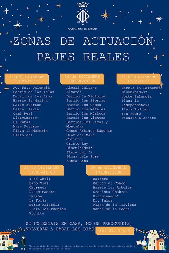 L'Ajuntament de Sagunt ha donat a conéixer les zones d'actuació, així com les data de la comitiva de Patges Reials. A causa de la demanda ciutadana per saber quin dia passaran els patges per les cases dels xiquets i xiquetes de la ciutat, des d'Alcaldia i de la delegació de Joventut i Infància s'ha emés un llistat de carrers, data i horaris.