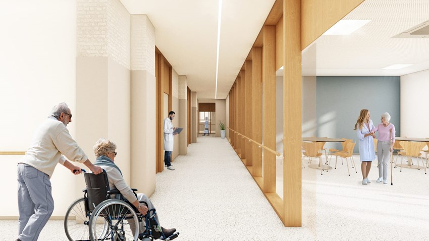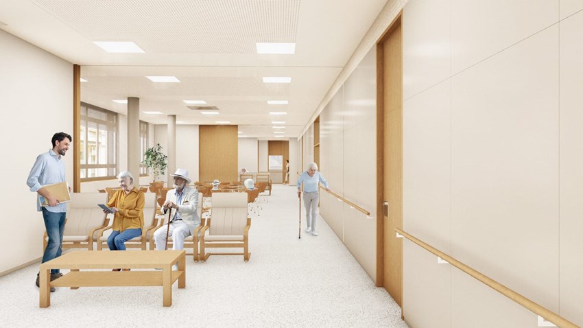 El corredor central comunicarà amb la cafeteria, a través de la qual es podrà accedir al gimnàs de rehabilitació. Al costat de la cafeteria hi haurà una xicoteta cuina-office.