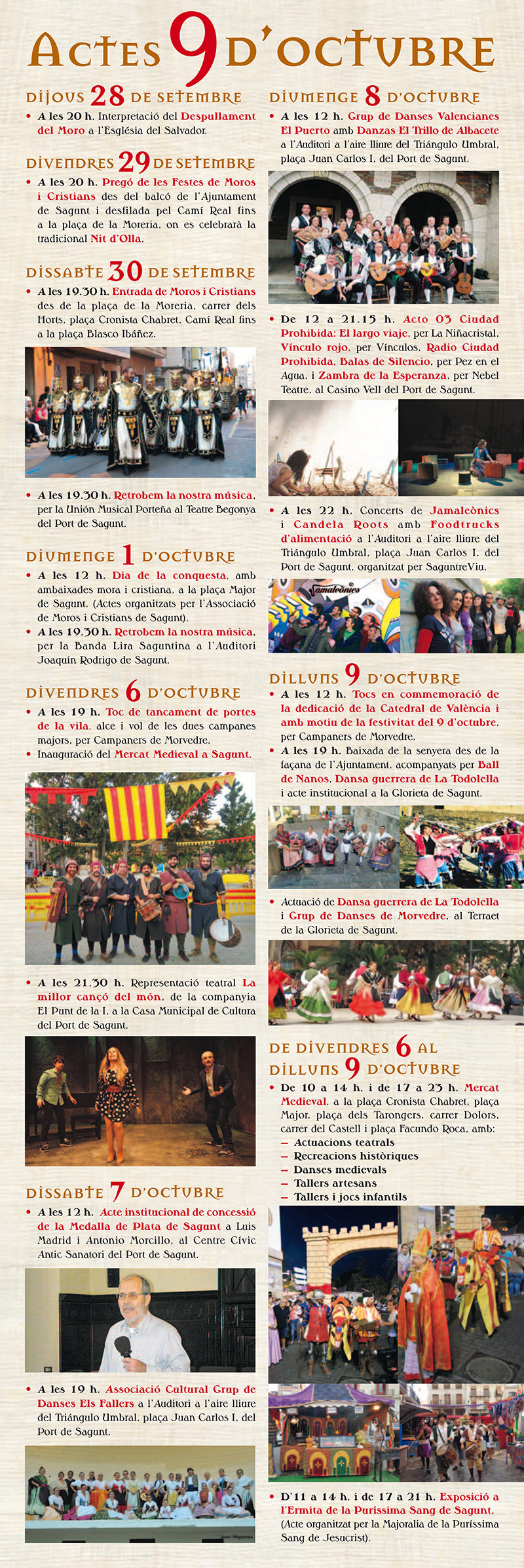 En el mercat medieval tindran lloc actuacions teatrals, recreacions històriques, danses medievals, tallers artesans i tallers i jocs infantils. El programa d’actes també inclou actuacions musicals a càrrec de la Banda Lira Saguntina i la Unión Musical Porteña, entre d’altres, a més de nombrosos espectacles de dansa.
