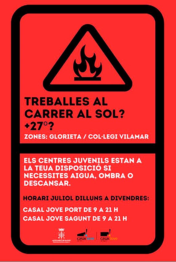 Davant les onades de calor que puguen generar-se durant l'estiu, tant el Casal Jove del Port de Sagunt (c/ Vent de Marinada s/n) prop del col·legi Vilamar, com el Casal Jove de Sagunt (c/ Romeu, 8) prop de la Glorieta, estaran oberts al juliol de dilluns a divendres des de les 9 a les 21 hores per a tots i totes aquelles treballadores que necessiten aigua, ombra o descansar.