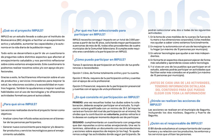 IMPULS és un projecte d’I+D+i que està desenvolupant l'Institut de Biomecànica de València (IBV) en diverses localitats de la Comunitat Valenciana, entre les quals es troba el municipi de Sagunt. El departament de Serveis Socials de l'Ajuntament de Sagunt col·labora en esta investigació que busca impulsar innovacions tecnològiques per a l'envelliment actiu i saludable. IMPULS està cofinançat per l'Institut Valencià de Competitivitat Empresarial (IVACE) i secundat per la Conselleria d'Igualtat i Polítiques Inclusives de la Generalitat Valenciana, així com per l'Asociación para el Cuidado de la Calidad de Vida (CVIDA).