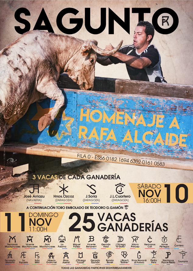 L'Associació Cultural i Taurina Bou de Sant Antoni, en col·laboració amb l'Ajuntament de Sagunt, ha programat un cap de setmana taurí en homenatge a Rafa Alcaide, qui va morir a principis d'enguany per un accident de cotxe. Les jornades benèfiques, en les quals també col·laboren els seus amics i familiars, seran el dissabte 10 i diumenge 11 de novembre. També hi col·laboren fins a 30 ramaderies i retalladors de tot Espanya de manera desinteressada. El recinte taurí s'ha instal·lat en l'esplanada situada al costat de la muntanya de Sant Cristòfol.