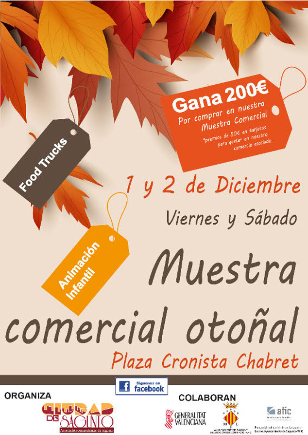 L'Associació de Comerciants ‘Ciutat de Sagunt’ organitza la Mostra Tardorenca. L'Ajuntament de Sagunt convida la ciutadania a gaudir de les activitats preparades per l'associació el divendres 1 i dissabte 2 de desembre, en la plaça Cronista Chabret, des de les 11.00 fins a les 22.00 hores.