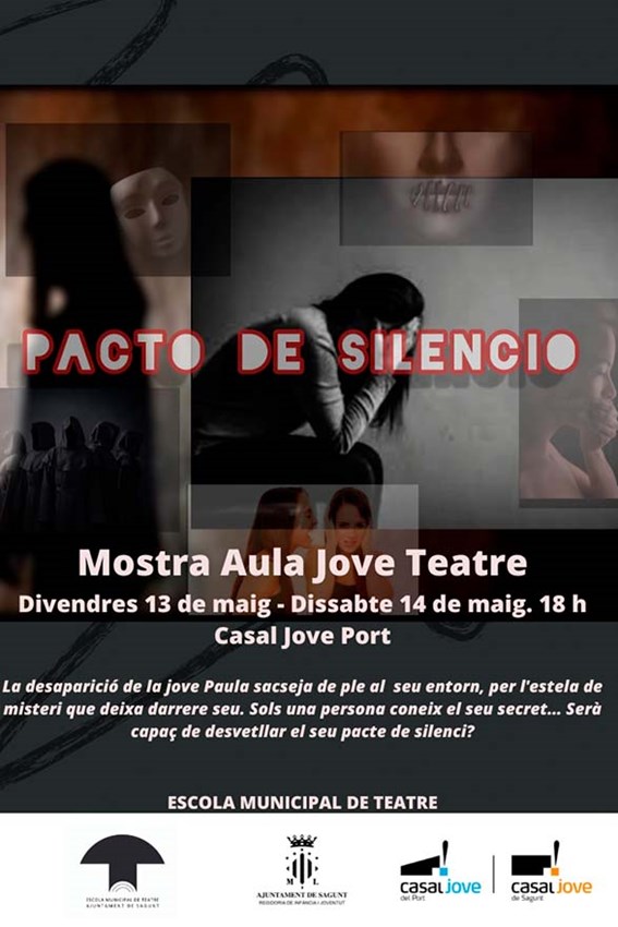 El grup 2 de l’Aula Jove de l’Escola Municipal de Teatre finalitzarà el curs amb la interpretació de l’obra Pacto de Silencio. L’actuació tindrà lloc els propers dies 13 i 14 de maig, divendres i dissabte de la setmana vinent, a les 18 hores en el Casal Jove del Port de Sagunt. L’entrada és gratuïta.