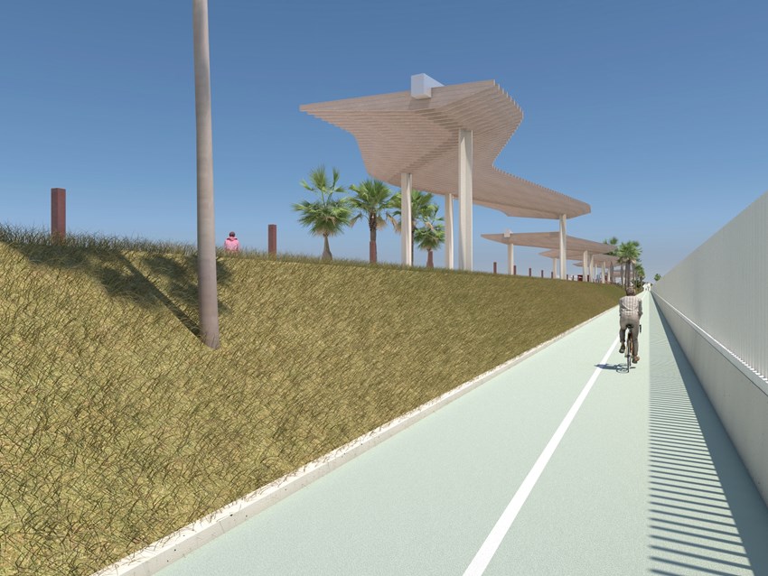 El projecte contempla solucions constructives amb diverses àrees com: Glorieta i entroncament amb el carrer Travessia del Mediterrani i Passeig Marítim; Escales d'accés i zona d'inici del passeig; Part central del passeig i espai d'activitats; Zona final del passeig i futur enllaç amb el pantalà; Zona d'interacció amb la platja; Zona del carril bici.