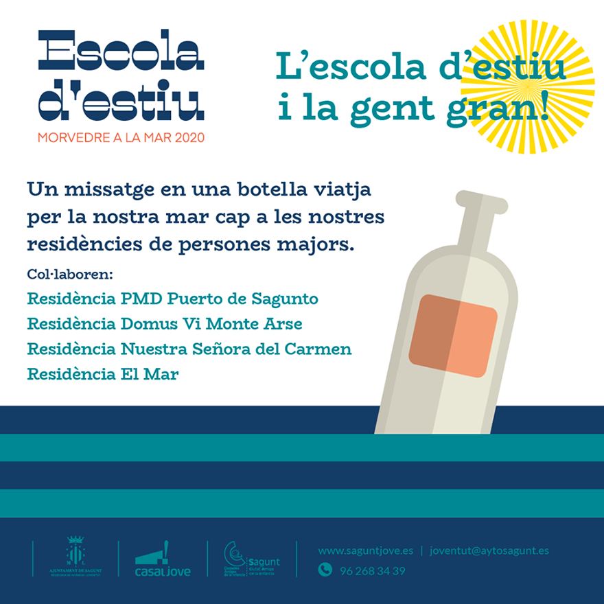 L'altra iniciativa és ‘L’escola d’estiu i la gent gran’, és una idea de suport i afecte a la població major que viu en les residències de Sagunt. Cal recordar que durant el confinament, la regidoria de Joventut i Infància ja va iniciar una col·laboració amb els equips dels centres per a alleujar el sofriment provocat per la falta de visites i la incertesa pel virus, acostant la població infantil i juvenil a la gent gran.