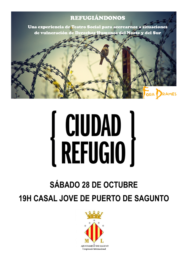 El próximo sábado, 28 de octubre, a partir de las 19h, tendrá lugar la obra de teatro Refugiándonos en el Casal Jove de Puerto de Sagunto. El montaje forma parte de las jornadas Ciudad Refugio, que está organizando durante el mes de octubre la concejalía de Cooperación Internacional, para denunciar la situación extrema de los refugiados.