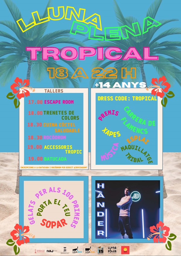 Amb el dress code i l'ambientació tropical, esta Lluna Plena mensual comptarà amb tallers molt estiuencs on la població jove que acudisca podrà aprendre a fer trenes de fil de 18 a 19 hores, a fer còctels saludables de 18.30 a 20 hores, i accessoris tropicals de 19 a 20 hores. Per als més aventurers també hi haurà un taller d'escalada de 18.30 a 20.30. Les inscripcions a este taller es realitzaran per missatge directe a Instagram de @jovesagunt.