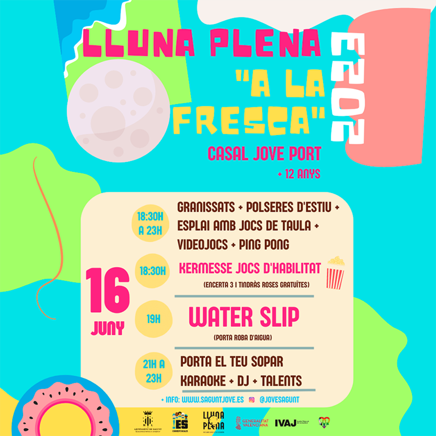 Des de les 21 hores fins a les 23 hores, Lluna Plena es transformarà en una Nit animada, on la joventut podrà portar el seu sopar i unir-se al karaoke i a la nit de talents.