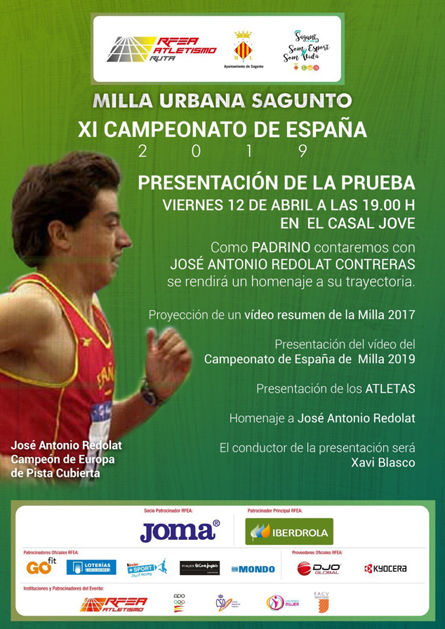 L'XI Campionat d'Espanya de Milla en Ruta Absolut i Màster es disputarà a Sagunt este cap de setmana. El divendres, 12 d'abril a les 19 h, tindrà lloc la presentació de la prova en el Casal Jove del Port de Sagunt, així com, la presentació dels i les atletes participants.
