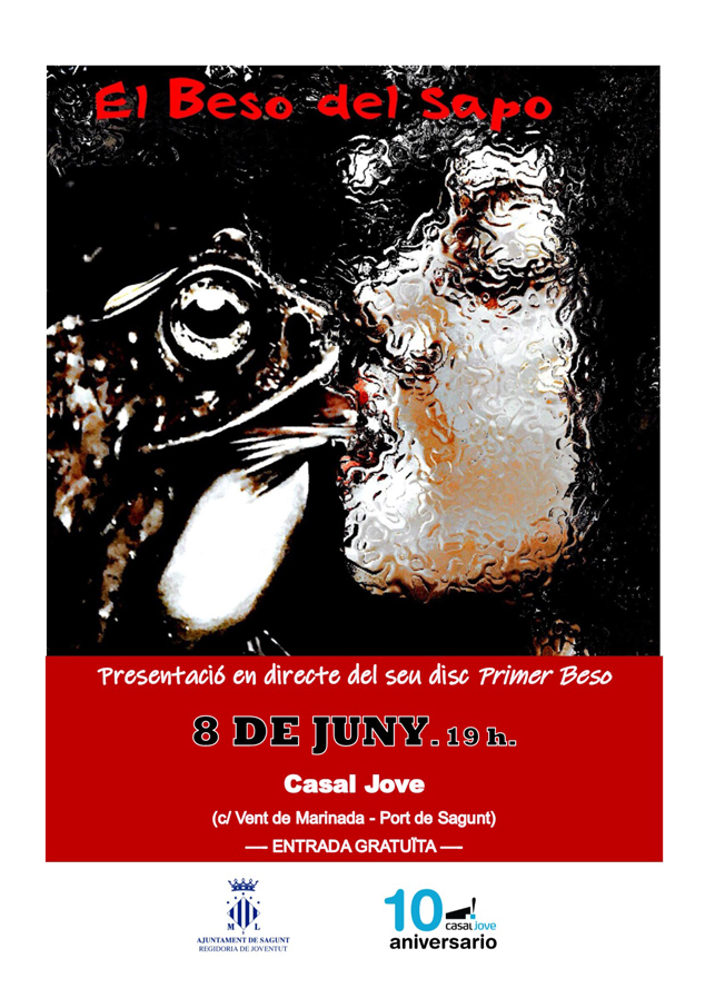 El dissabte 8 de juny, a les 19 hores, el grup de música local El beso del Sapo presentarà el seu nou treball, Primer Beso, en el Casal Jove. L'entrada a l'esdeveniment és gratuïta i s'emmarca en el cicle Concerts del Casal, organitzat per la regidoria de Joventut de l’Ajuntament de Sagunt.
