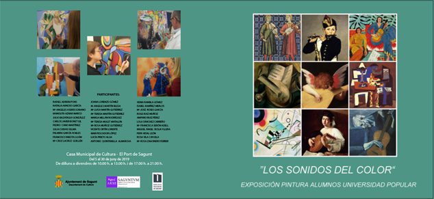 Del 5 al 30 de junio, se podrá visitar en la Casa Municipal de Cultura del Puerto de Sagunto la exposición artística del alumnado del Curso de Pintura de la Universidad Popular Los sonidos del color. Esta muestra se inaugura el miércoles 5 de junio a las 19 h y forma parte del programa de la delegación de Cultura del Ayuntamiento de Sagunto.